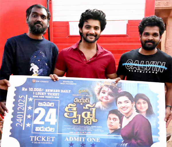 పి.ఎన్.బి సినిమాస్ బ్యానర్ పై రూపొందిన యూత్ ఫుల్ ఎంటర్ టైనర్ ‘డియర్ కృష్ణ’ చిత్రం నుంచి తాజాగా బిగ్ టికెట్ రిలీజ్ అయింది. హీరో ఆది నటిస్తున్న శాంబల చిత్రం సెట్ కు ఈ రోజు డియర్ కృష్ణ మూవీ టీమ్ వెళ్లింది. ఆది సాయికుమార్ చేతుల మీదుగా బిగ్ టికెట్ ను విడుదల చేశారు. అక్షయ్ హీరోగా, ‘ప్రేమలు’ చిత్రంతో తెలుగు వారికి దగ్గరైన బ్యూటీ మమిత బైజు, మరో బ్యూటీ ఐశ్వర్య హీరోయిన్ గా నటిస్తున్న ఈ చిత్రం నుంచి విడుదలైన ట్రైలర్ సోషల్ మీడియాలో దూసుకెళ్తుంది. ఈ సందర్భంగా మూవీ ప్రమోషన్స్ కూడా శరవేగంగా జరుగుతున్నాయి. ఈ చిత్రం జనవరి 24న ప్రేక్షకుల ముందుకు వచ్చేందుకు రంగం సిద్దం అవడంతో మూవీ యూనిట్ హీరో ఆదితో బిగ్ టికెట్ ను రిలీజ్ చేశారు.