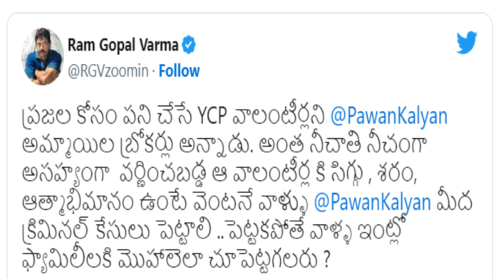 స్వతంత్ర వెబ్ డెస్క్: జనసేన అధినేత పవన్ కళ్యాణ్ పై దర్శకుడు రామ్ గోపాల్ వర్మ నిప్పులు చెరిగారు. ఏలూరులో జరిగిన వారాహి సభలో వాలంటీర్ల వ్యవస్థపై పవన్ కళ్యాణ్ చేసిన వ్యాఖ్యలను ప్రముఖ దర్శకుడు రామ్ గోపాల్ వర్మ తప్పుబట్టారు. వాక్ స్వాతంత్ర్యం ఉన్నది అభిప్రాయాలు చెప్పడానికి, భిన్నాభిప్రాయాలతో చర్చాకార్యక్రమాలతో వాదించడానికి అని స్పష్టం చేశారు. కానీ నిరాధార ఆరోపణలు చేయడానికి కాదని పవన్ కు హితవు పలికారు. రెండు లక్షల పుస్తకాలు చదివిన పవన్ కల్యాణ్ కు ఇది తెలియకపోవడం అతడి చదువులేనితనాన్ని నిరూపిస్తోందని విమర్శించారు.
